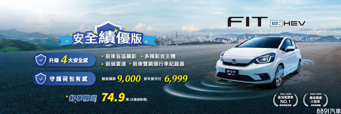 Fit油電車型也祭出安全績優特仕版,除了升級前後盲區顯影輔助、多媒體娛樂影音主機、前雷達、行車紀錄器四項配備,再現折3萬,並適用低頭款9千、首年低月付6999優貸方案。