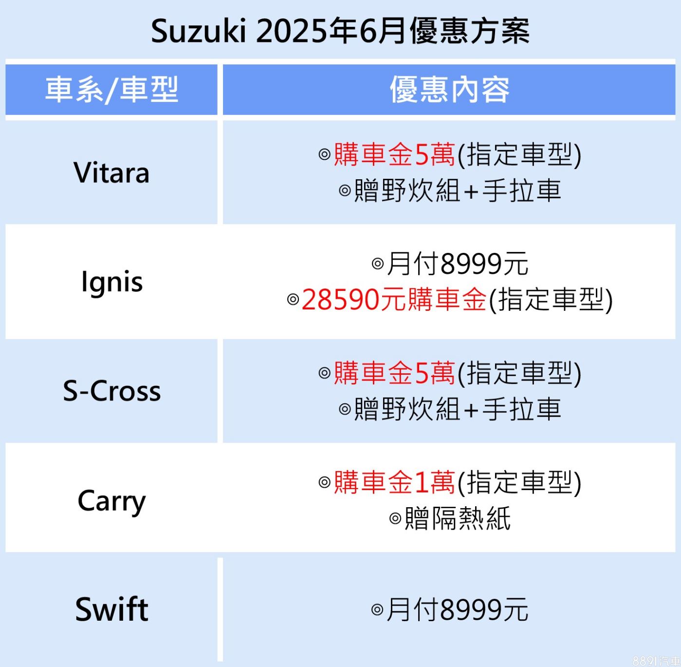 針對其他車款,入主Swift適用月付8999元優貸專案;Vitara和S-Cross指定車型同步享購車金5萬,以及野炊組+手拉車。58萬輕鬆貸!馬上獲取分期方案>>