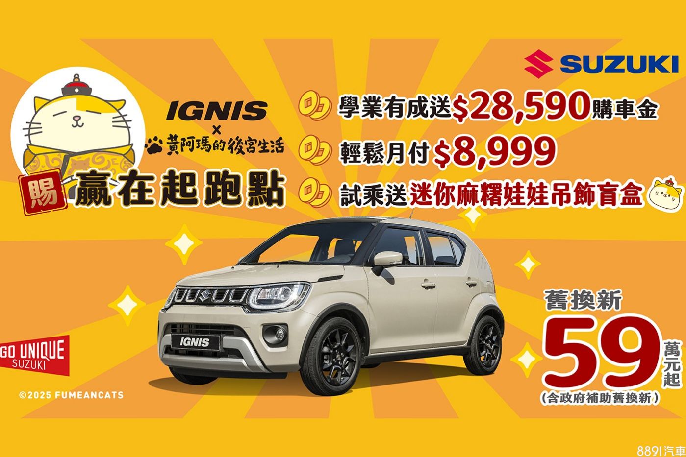 至2025年6/30止,Ignis除了加價3萬元即可升級黃阿瑪的後宮生活聯名版本,入主指定車型,凡出示畢業證書或專業課程結業證明,即享有28590元購車金。此外,還提供月付8999元輕鬆付專案,來店試乘更可獲得黃阿瑪迷你麻糬娃娃吊飾盲盒。