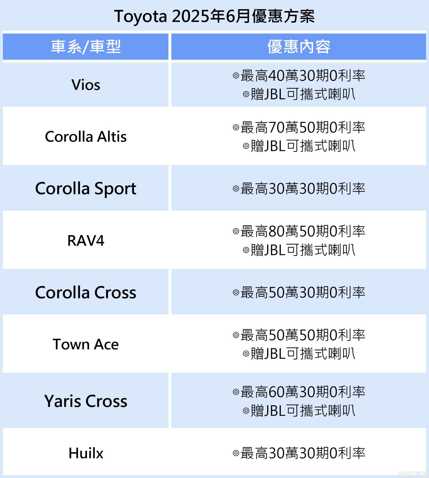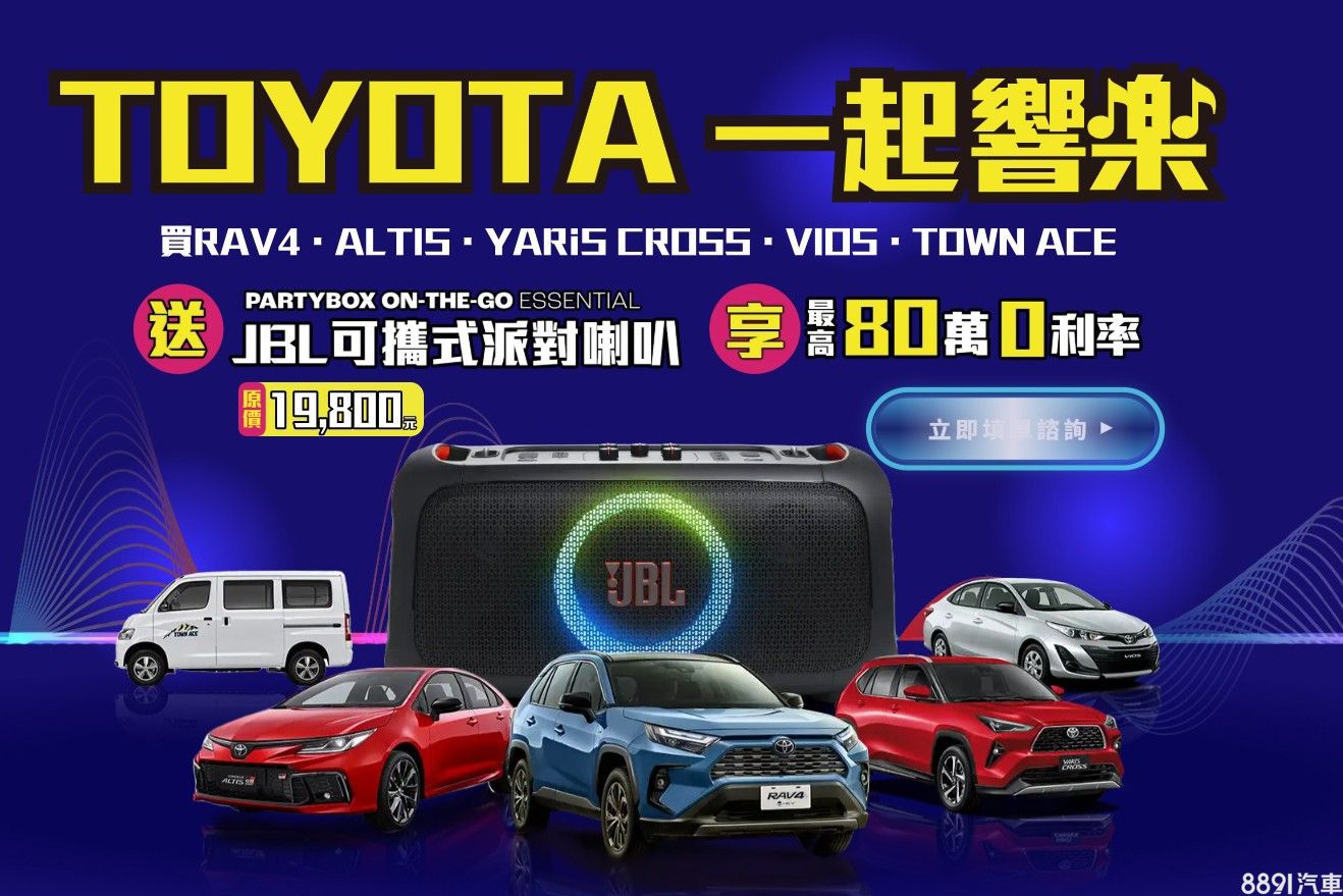 Toyota台灣總代理和泰汽車,於6月持續推出限量「一起響樂」優惠活動,凡於本月入主RAV4、Altis、Yaris Cross、Town Ace、Vios,就送原價19800元的JBL PartyBox On-the-Go Essential可攜式派對喇叭,並同步享高額分期0利率,其餘車款亦適用高額分期0利率優惠。輸入車款,3秒獲取分期方案,立即試算>>