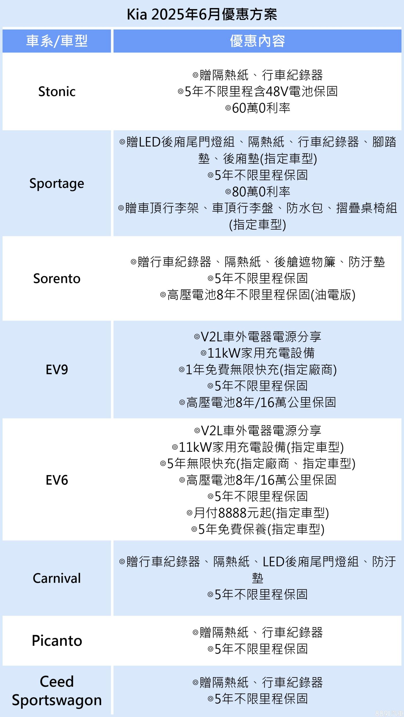 EV6指定車型則適用五年0元盡情駕馭專案,包括V2L車外電器電源分享器、家用充電設備、五年指定廠商無限快充,以及五年免費保養等尊榮禮遇,再享高額100萬0利率或首年低月付8888元。同時,Kia乘用車全車系皆享有5年不限里程全車原廠保固,電動車高壓電池再享8年/16萬公里原廠保固。瞭解不同地區成交價,免費查詢>>