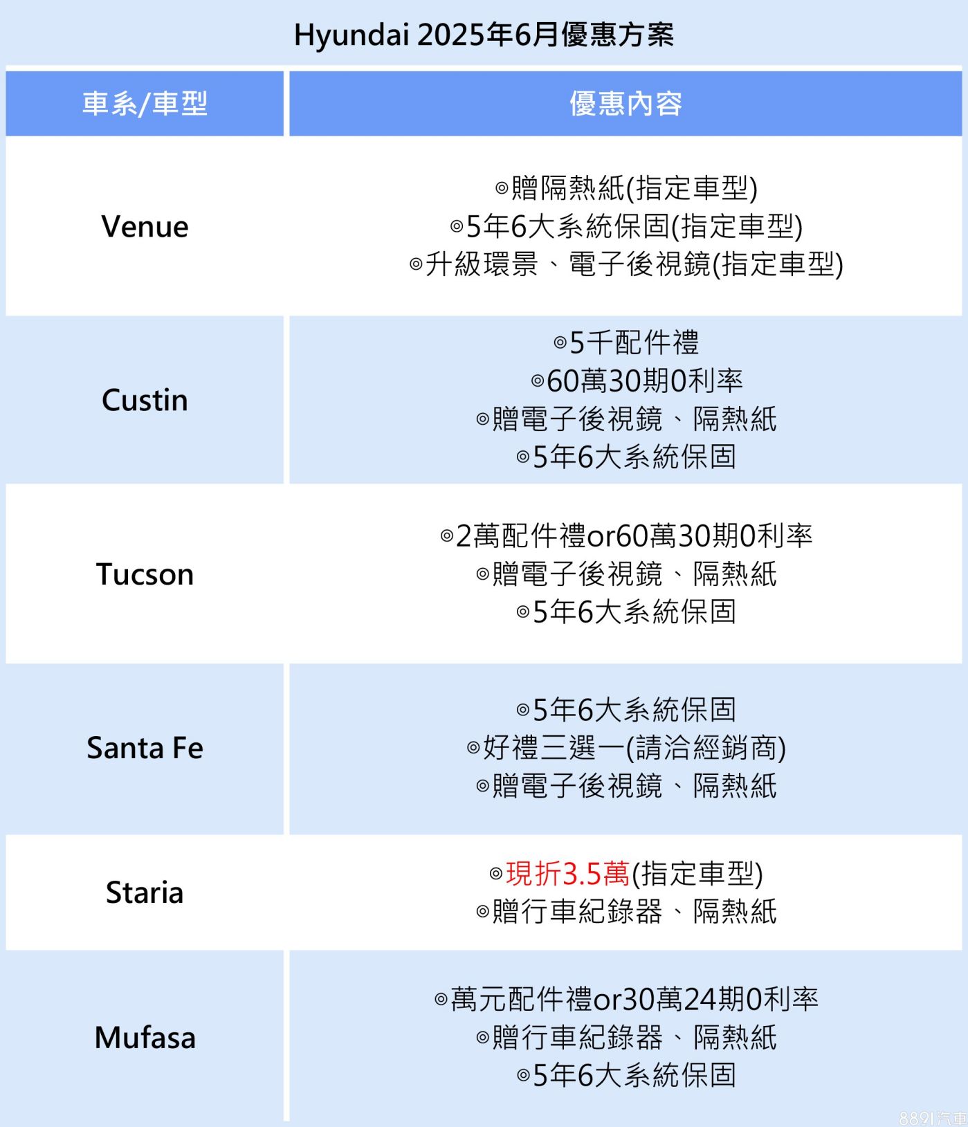 原廠也趁勢推出六月購車優惠,除了全車系指定車型均享5年六大系統不限里程保固,Staria現折3.5萬,再送行車紀錄器、隔熱紙;其他如Tucson、Mufasa、Venue、Custin和Santa Fe,也依車型不同,入主就贈隔熱紙、電子後視鏡或行車紀錄器!帶家人一起試乘去!一鍵試駕,立即體驗>>