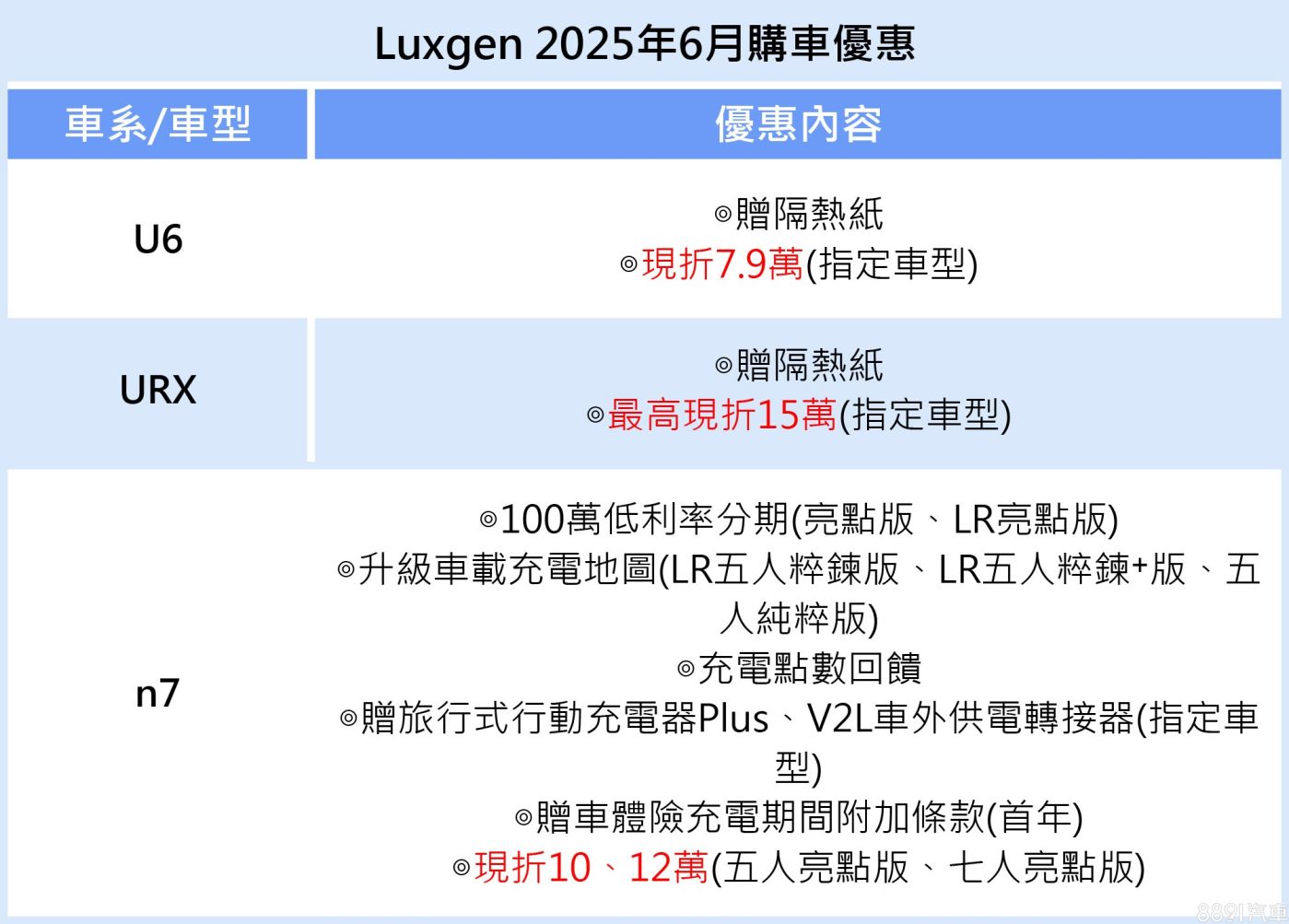 凡於六月入主n7,依車型不同,有100萬低利率分期優貸、無料升級車載充電地圖、充電點數回饋、加贈旅行式行動充電器Plus、V2L車外供電轉接器,以及車體險充電期間附加條款等多重好康,此外,n7五人亮點版、七人亮點版分別祭出最實在的現金折價,前者下殺10萬、後者現折12萬!