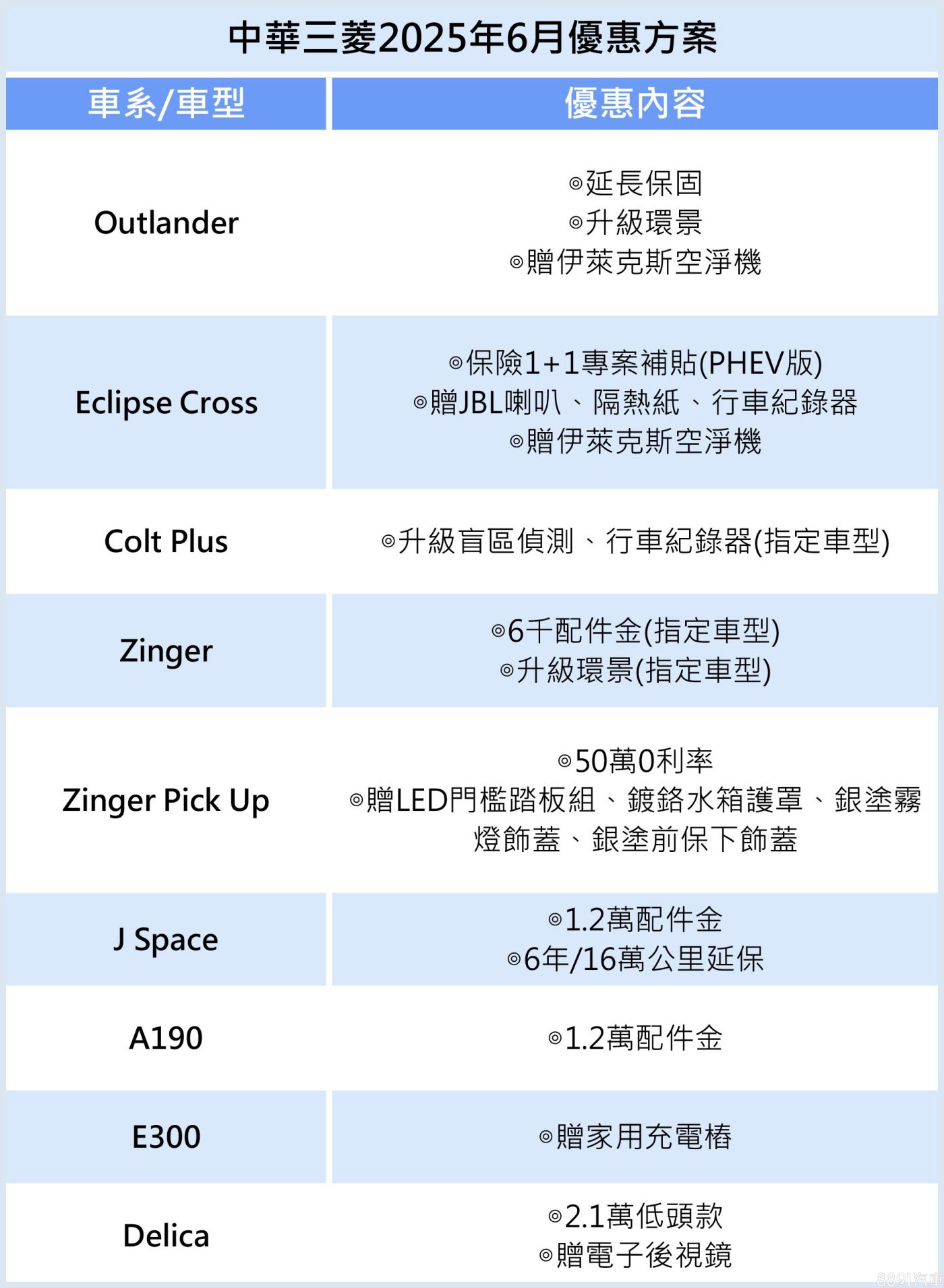 至2025/06/30止,凡下訂Outlander、Eclipse Cross指定車型,並完成領牌程序,即可獲得Electrolux雙效涼風循環頂級空淨機。當紅車款也有多樣優惠,如Zinger指定車型享6千配件金,以及升級環景;Zinger Pick Up除了適用50萬0利率,再加贈LED門檻踏板組、鍍鉻水箱護罩、銀塗霧燈飾蓋、銀塗前保下飾蓋等;J Space全車系則可享1.2萬配件金,加上延長保固!立即預約試駕體驗>>