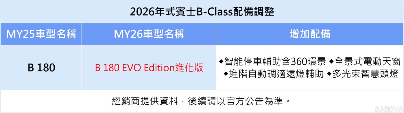 26年式B-Class更新為進化版,同樣將原選配納為標配,增列多光束智慧LED頭燈、全景式天窗、智能停車輔助含360環景等配備,強化產品戰力。