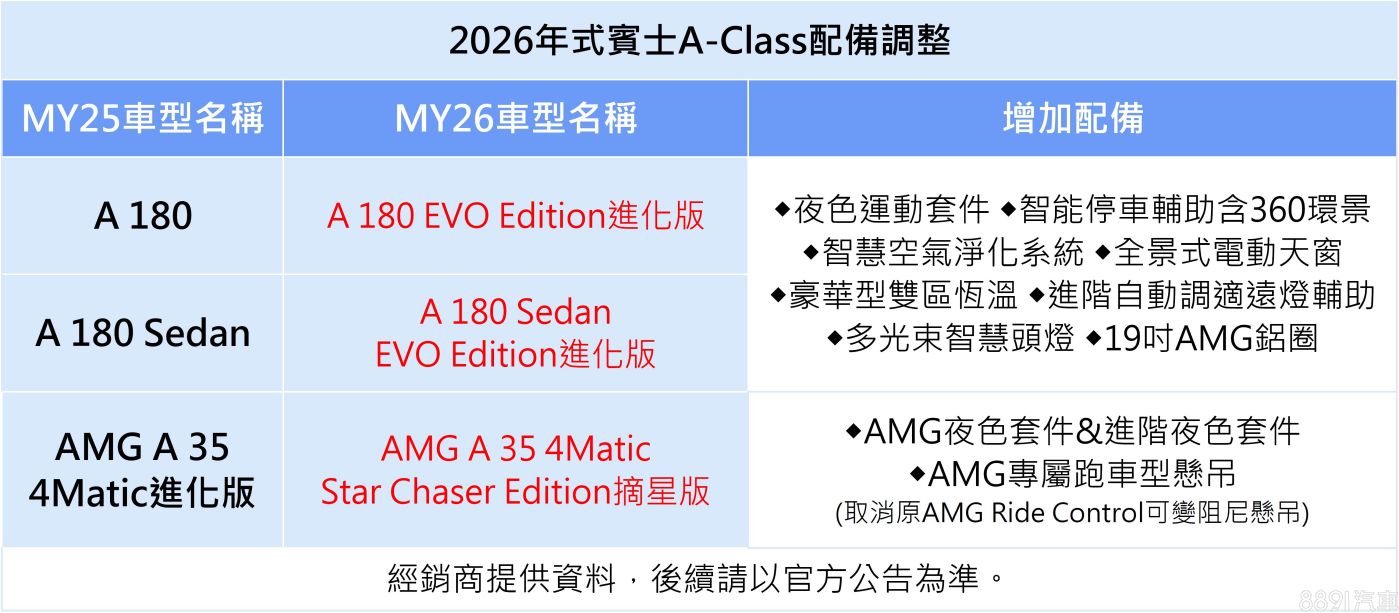 26年式A180及A180 Sedan進化版,預計添加多光束智慧LED頭燈、智能停車輔助含360環景、電動天窗等配備:AMG A 35摘星版除了升級進階夜色套件外,懸吊系統從原本AMG Ride Control可變阻尼懸吊,降級為AMG跑車型懸吊,藉此跟頂規A 45 S拉出更明顯的差距,同時也取消抬頭顯示器、雙側Logo投射燈等原配備。