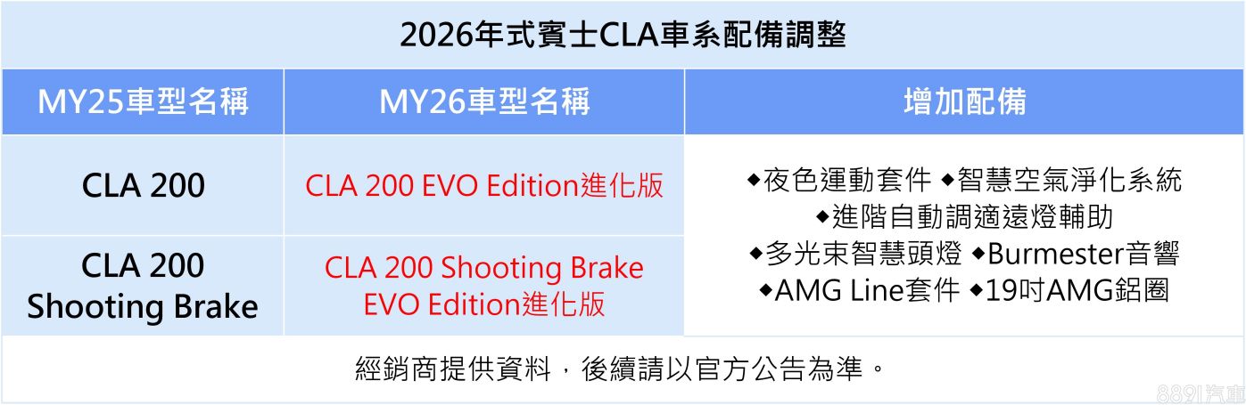 四門轎跑CLA及五門獵跑CLA Shooting Brake,26年式入門款將更新為進化版,全面標配AMG Line+夜色套件、多光束智慧LED頭燈、Burmester音響、智慧空氣淨化系統等等。