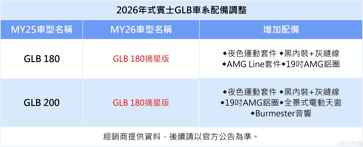 2026年式GLB也會比照辦理,推出GLB 180與GLB 200摘星版,配備調整大同小異,入門款新增AMG Line與夜色套件,高規款增列全景式電動天窗、Burmester音響等配備,讓用車體驗更加分。不過「有得也有捨」,GLA與GLB皆會取消後座前後滑移與行李廂管理套件。