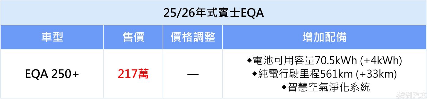 台灣賓士針對旗下豪華小車陣容推出25/26年式,部分車型配備大幅升級,但售價僅小漲1萬,入門電動休旅EQA與EQB則針對電池組容量加大,換來更優異的續航里程。<想入主賓士豪華小車?輸入車款,3秒獲取分期方案,立即試算>