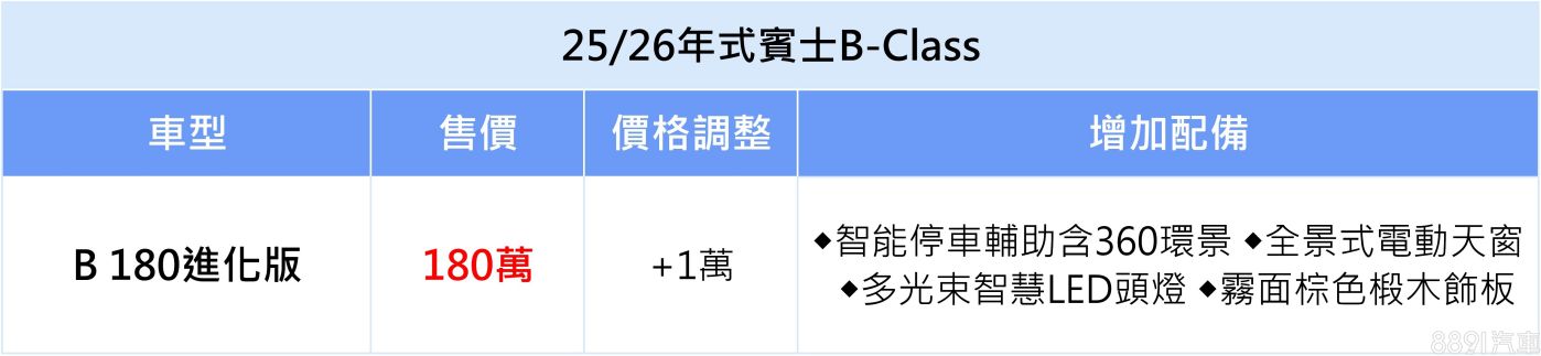 25/26年式B 180更新為進化版,增列多光束智慧LED頭燈、全景式電動天窗、智能停車輔助含360度環景等配備,強化產品戰力。