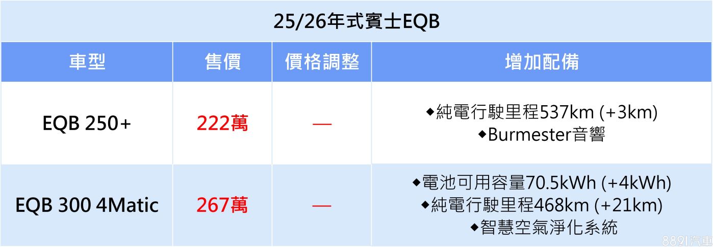 新年式EQA供應單一車型,但改由EQA 250+取代原先EQA 250,兩者主要差異在於電池可用容量自66.5kWh提升至70.5kWh,WLTP續航里程提升至561km;至於EQB維持雙車型不變,其中EQB 300 4Matic也換上70.5kWh電池組,WLTP續航里程提升至468km,而這些實質的續航力提升,在規劃旅程時更具彈性。