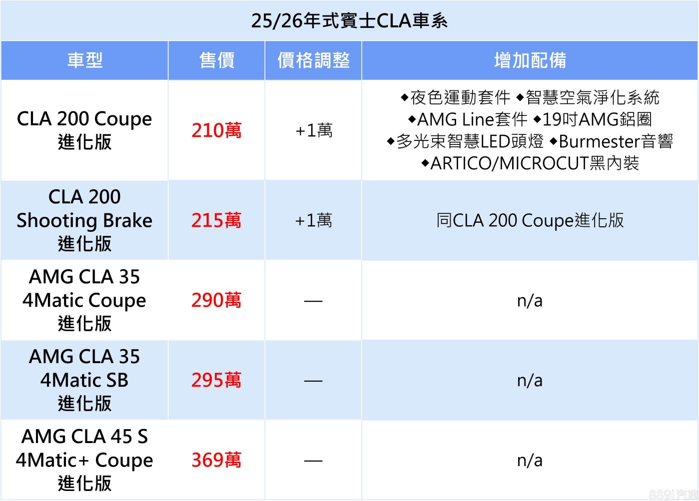 四門轎跑CLA Coupe及五門獵跑CLA Shooting Brake,比照A-Class辦理,同樣將入門款升級為進化版,價格漲1萬,但換來夜色運動套件、AMG Line套件、多光束智慧LED頭燈、Burmester音響等豐富配備。