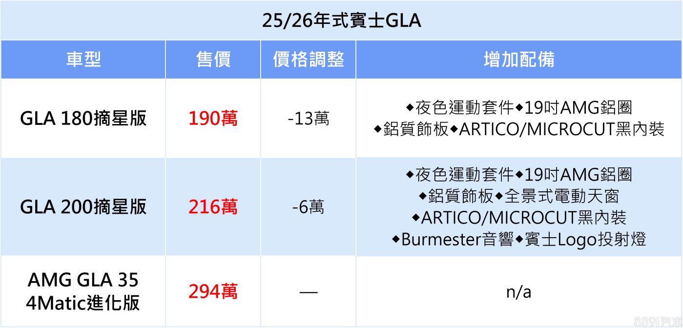 25/26年式GLA 180與GLA 200更新為摘星版,追加夜色運動套件、19吋AMG鋁圈等強化外觀視覺效果,後者還多添Burmester音響、全景式電動天窗,提升用車體驗。