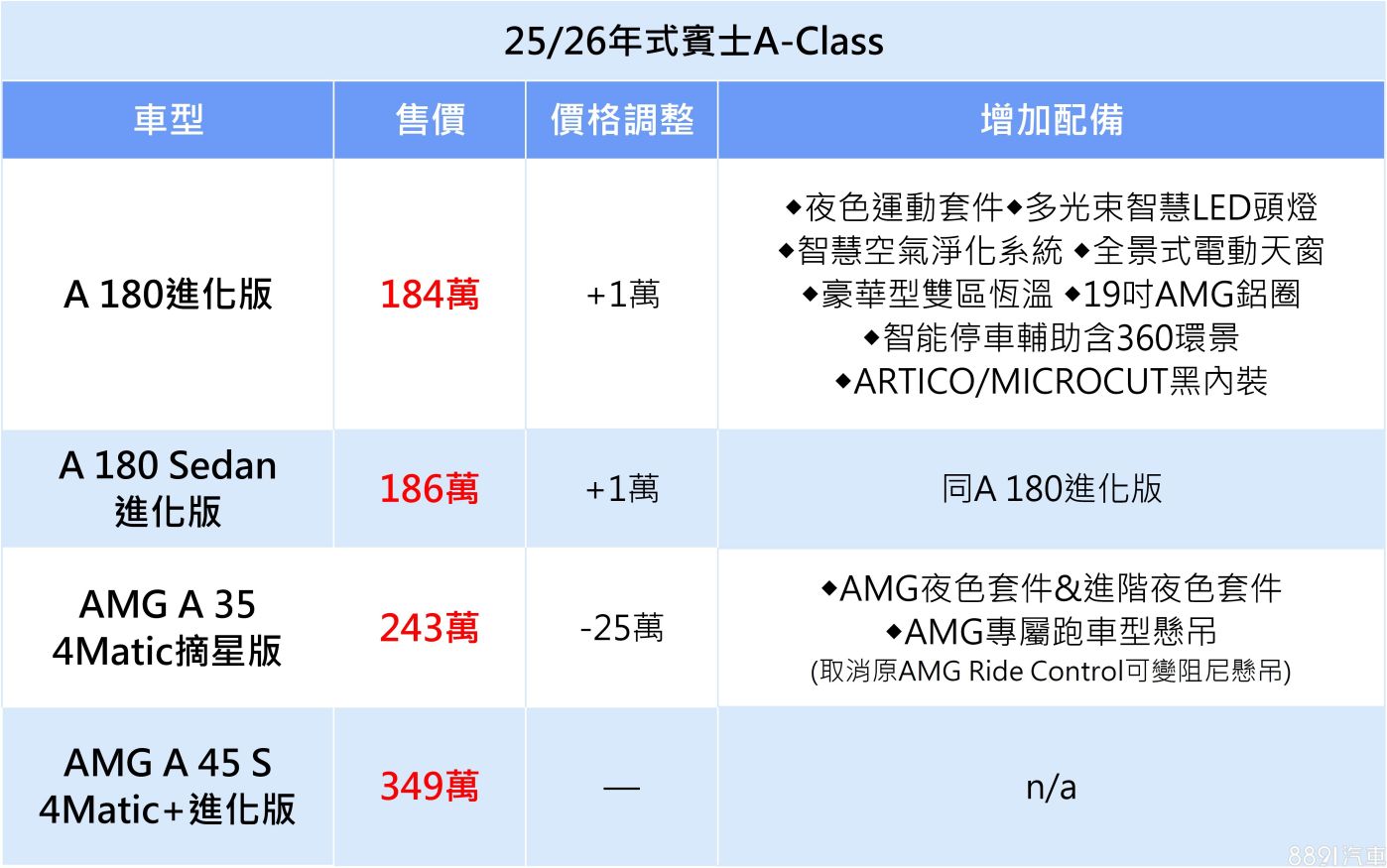 首先,A 180五門掀背及四門轎車皆更新為進化版,除了導入帥氣的夜色運動套件外,更追加多光束智慧LED頭燈、全景式電動天窗、智能停車輔助含360度環景等實用配備,但價格僅小漲1萬;至於AMG A 35則推出全新摘星版,入手門檻大降25萬,藉此跟性能頂規A 45 S拉出更明顯的差距,而降價主因是原搭載AMG Ride Control可變阻尼懸吊,降級為AMG跑車型懸吊,同時抬頭顯示器也改為選配。