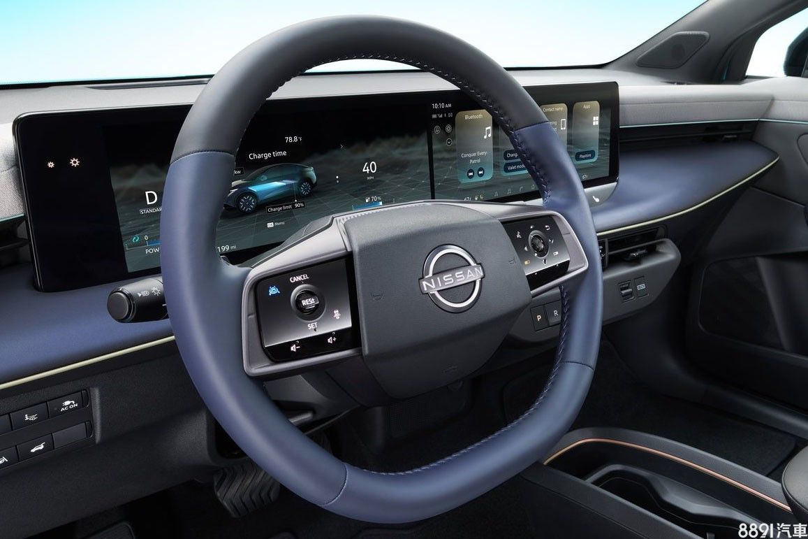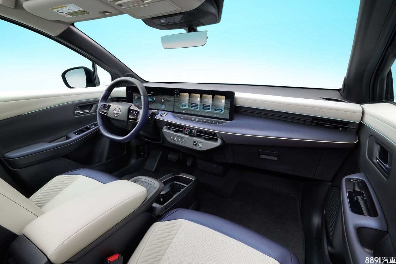 車室採用極簡鋪陳與雙色內裝,提供黑紫或白紫兩種選項,雙幅式方向盤已於Ariya上可見,導入採相連式設計的12.3吋數位儀錶與14.3吋觸控式多媒體系統,先前原廠就預告過,會提供可電控調光功能的全景玻璃車頂作為選配項目。