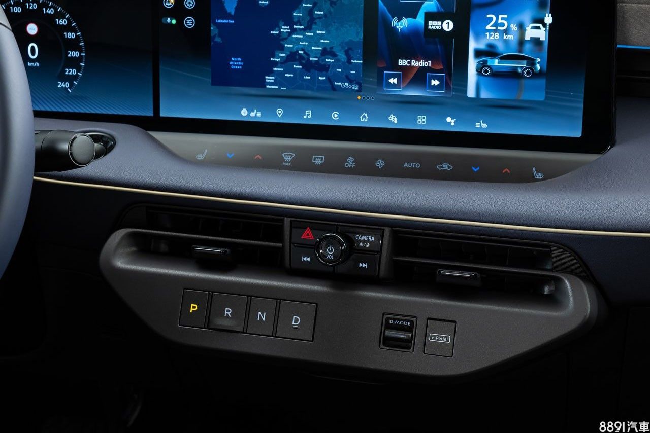 多媒體螢幕下方為空調觸控介面,前排出風口下方則為按鍵式排檔,以及e-Pedal Step單踏板加減速按鍵,新車的動能回收系統能選擇自動,或透過換檔撥片進行段數調整。