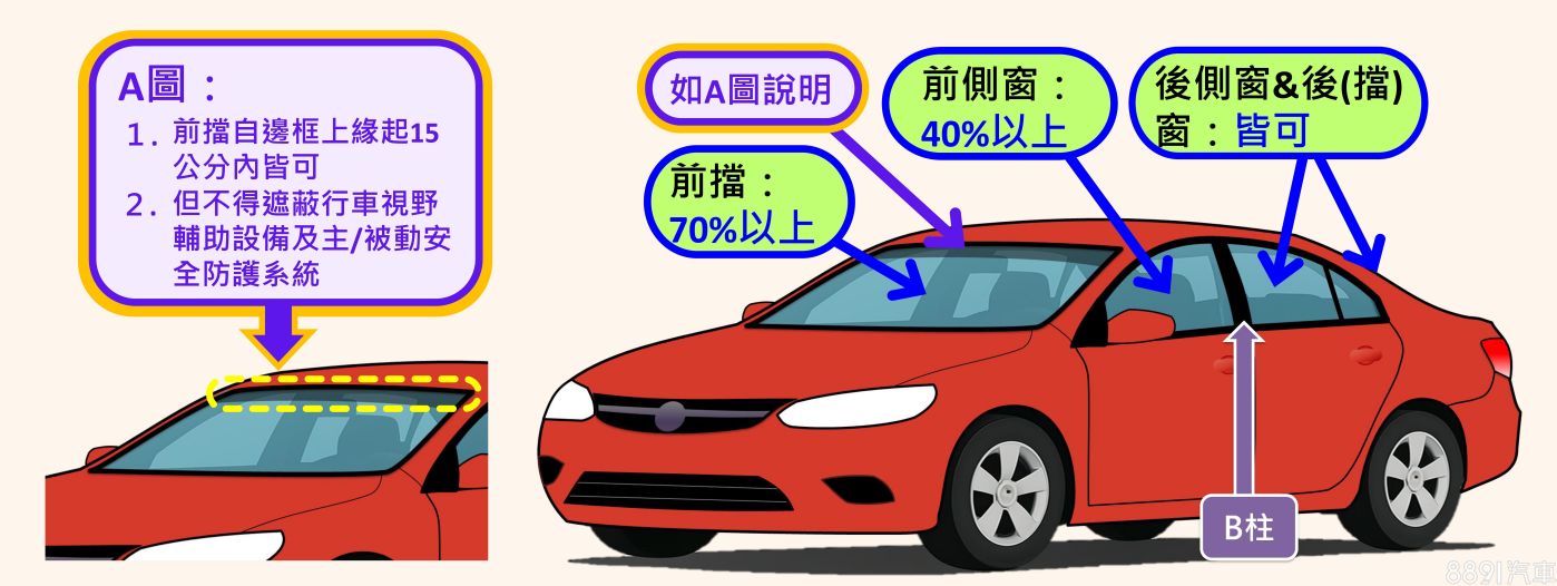 交通部提到,考量我國氣候環境、國人用車習慣、隔熱紙價格可負擔性,並比較各國規範後,以車輛「B柱」為主要分水嶺,B柱以前攸關行車視野安全,因此建議一般車輛前擋黏貼透光率70%以上、前側窗40%以上隔熱紙,以確保駕駛行車視線足夠清晰,後檔及後側窗則無限制。