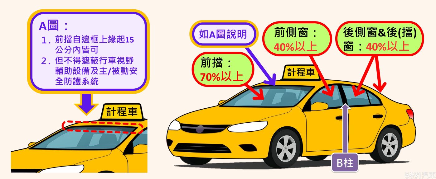 至於計程車屬於汽車運輸業,考量民眾乘車上的安全疑慮,因此除了前三片玻璃需符合規定外,後檔與後側窗隔熱紙也要求透光率需達40%以上。