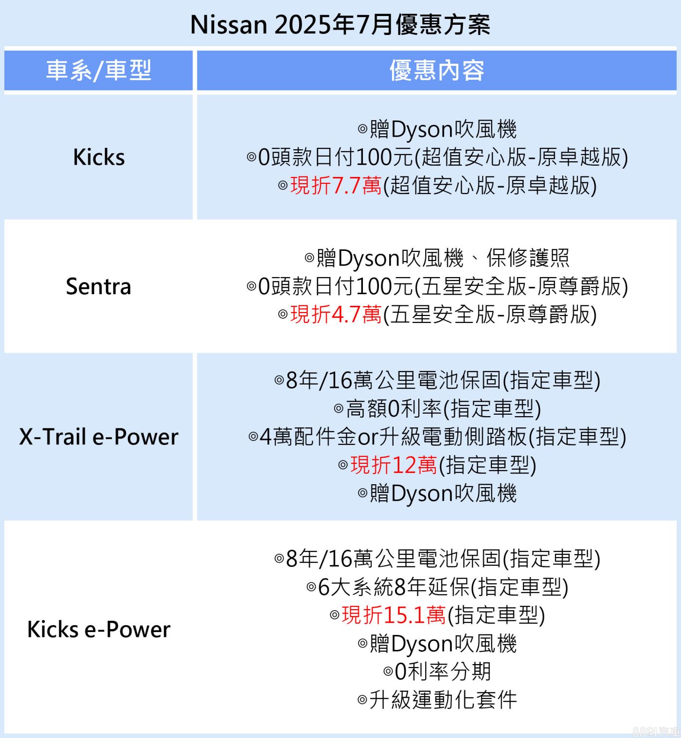 進口身分的X-Trail e-Power和Kicks e-Power優惠更大,前者指定車型現折12萬、後者指定車型現折15.1萬,並有多樣好康,如8年/16萬公里電池保固、Dyson吹風機、0利率分期與配備升級等。