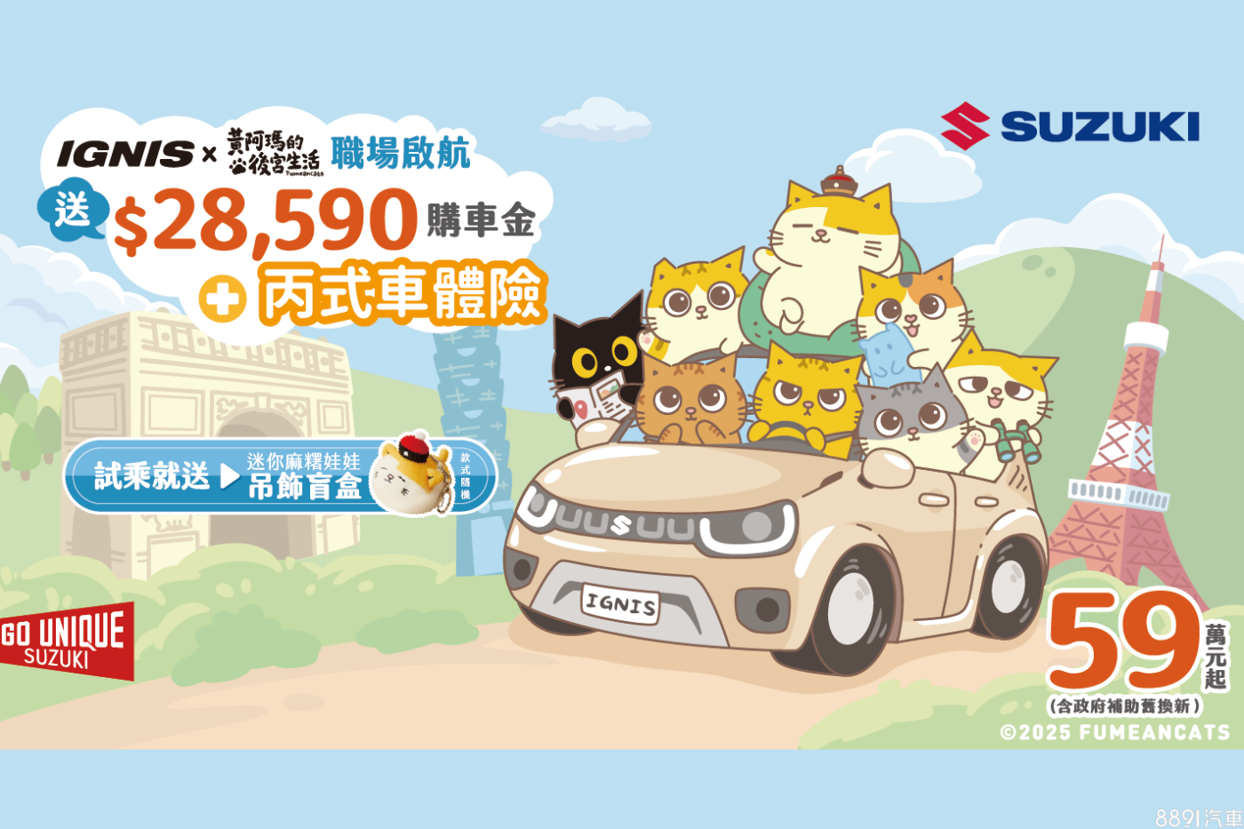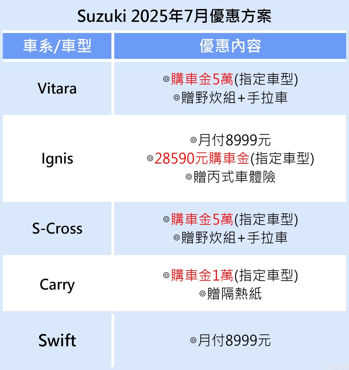 至2025年7/31止,入主Ignis指定車型,凡出示畢業證書或專業課程結業證明,領牌即享有28590元購車金,再加碼丙式車體險。針對其他車款;入主Swift適用月付8999元優貸專案;Vitara和S-Cross指定車型同步享購車金5萬,以及野炊組+手拉車。獲取專屬分期方案>>