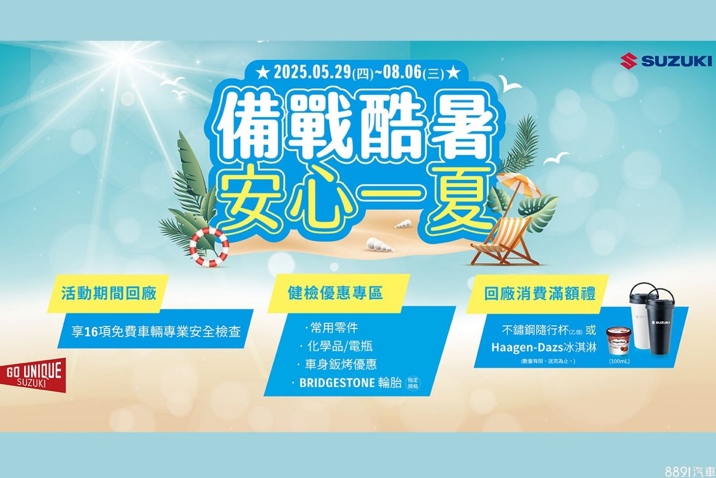 此外,至8月6日止,Suzuki全面實施「夏季健檢活動」,包含16項愛車免費健診服務,回廠消費還有滿額禮,另針對常用零件、電瓶、輪胎、車身鈑烤等,均祭出相關優惠,欲知詳情可洽免付費服務專線:0800-098-345。