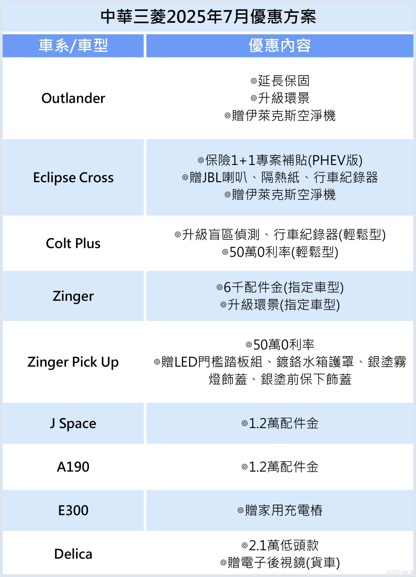 凡下訂Outlander、Eclipse Cross指定車型,並完成領牌程序,即可獲得Electrolux雙效涼風循環頂級空淨機。當紅車款也有多樣優惠,如Zinger指定車型享6千配件金,以及升級環景;Zinger Pick Up除了適用50萬0利率,再加贈LED門檻踏板組、鍍鉻水箱護罩、銀塗霧燈飾蓋、銀塗前保下飾蓋等;J Space全車系則可享1.2萬配件金。