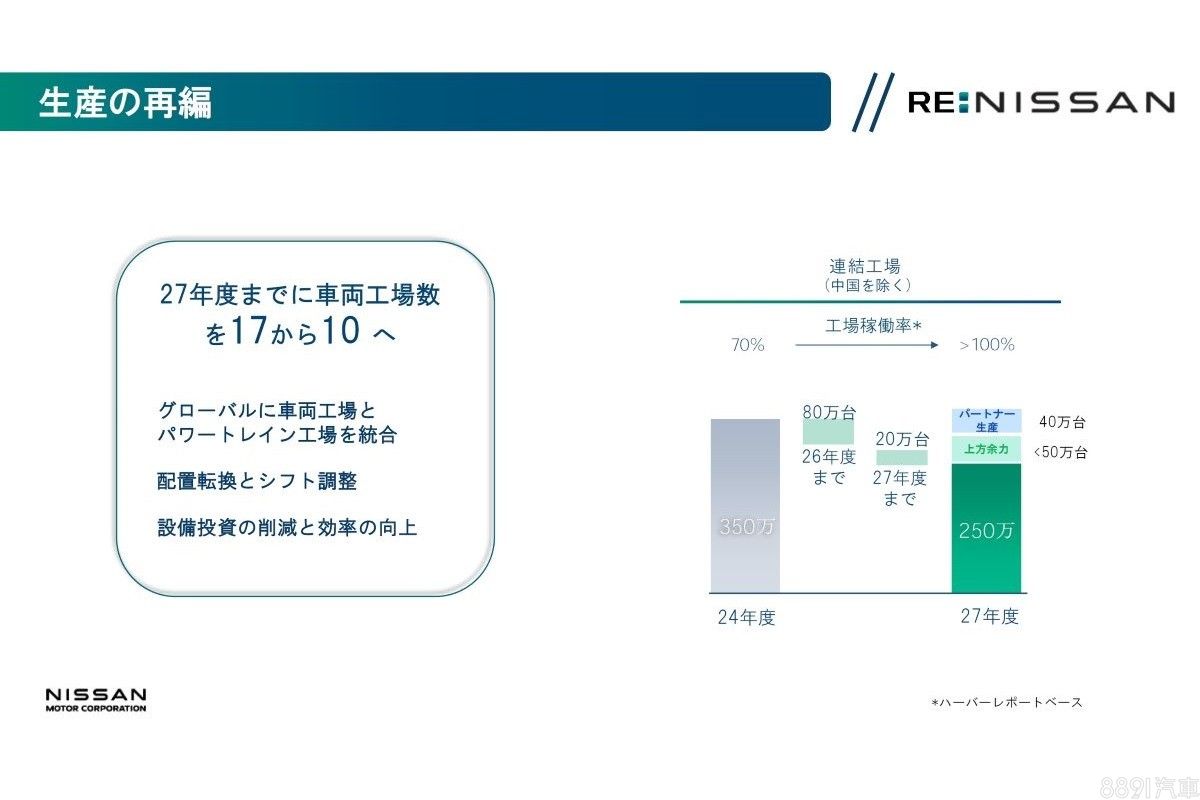 為了拯救吃緊的財務狀況,日產在今年5月發布了「Re:Nissan」的業務重組計劃,計畫到2027財政年度陸續裁員2萬人,工廠將從目前的17座縮減至10座。由於追濱工廠主力生產的Note與Note Aura銷量不佳,導致產線閒置率過高,恐面臨工廠整併或關廠,因此Nissan才會尋求鴻海合作,將過剩的產能用來生產鴻海電動車。