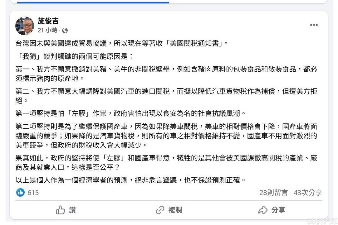 經濟部長郭智輝7日赴立法院經濟委員會,受訪時僅稱對美關稅「還在談判中」,並沒有透露更多資訊,但也側面說明了台美雙方仍未達成共識。而前行政政院副院長施俊吉在臉書發文指出,台美遲遲無法達成協議,主要卡在兩個核心問題,其一是不願意撤銷對美豬、美牛的非關稅壁壘;其二是不願意大幅調降對美國汽車的進口關稅,而擬以降低汽車貨物稅作為補償,但恐遭美方拒絕。(圖擷取施俊吉臉書)