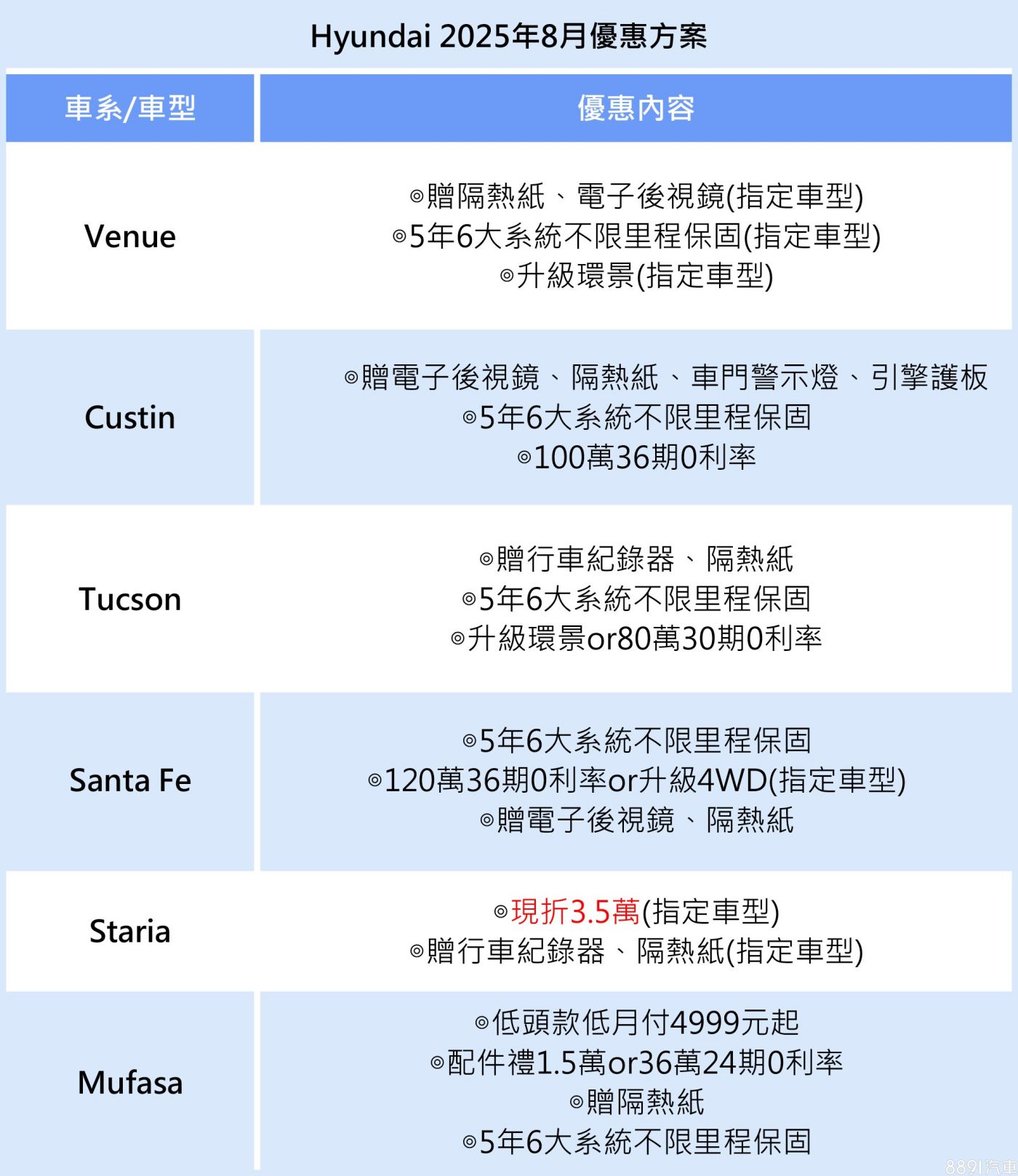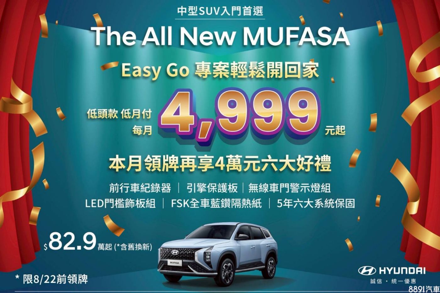 Hyundai本月入主全車系指定車型均可享5年6大系統不限里程保固,試駕還能抽Switch 2遊戲主機。針對Mufasa,特別推出低頭款低月付專案,每月只需付4999元起就能帶回家,另贈隔熱紙、配件禮1.5萬o等好康。