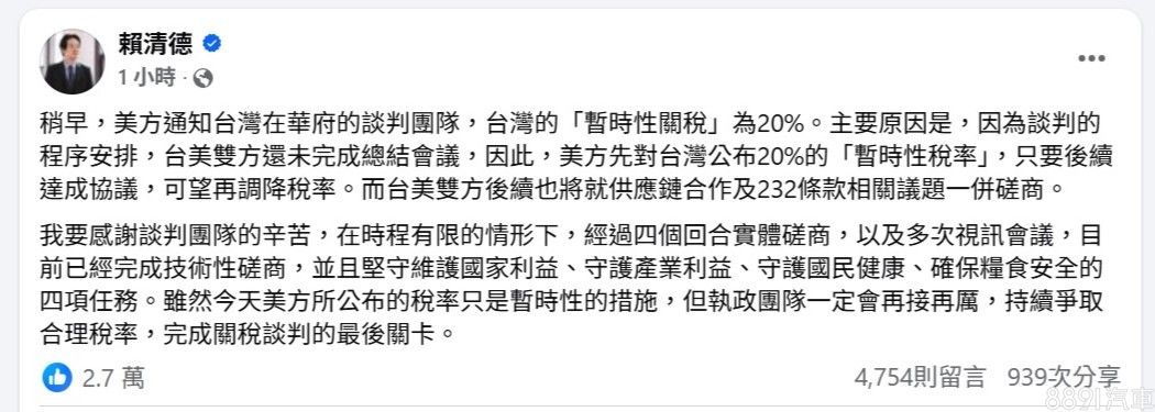 不過賴清德總統稍早FB發文稱,美國目前公布對台關稅為「暫時性關稅」。主要原因是台美雙方還未完成總結會議,因此,美方先對台灣公布20%的「暫時性稅率」,只要後續達成協議,可望再調降稅率。而台美雙方後續也將就供應鏈合作及232條款相關議題一併磋商。