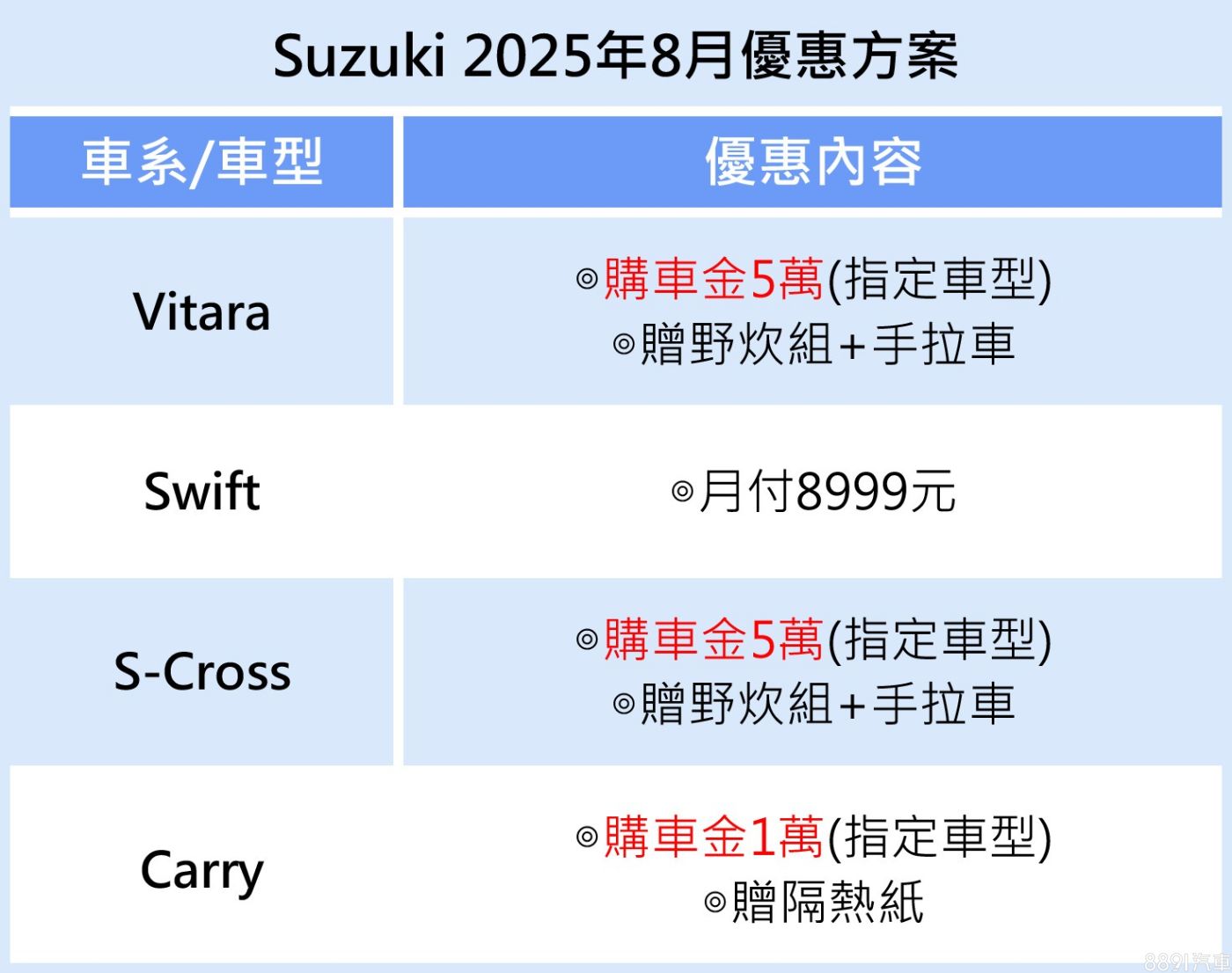 不只Swift,本月入主Vitara與S-Cross指定車型,也能享有最高5萬元購車金回饋,能於購車當次抵用,並加贈野炊組與手拉車。而頭家好幫手Carry,不僅加碼贈送「米其林防爆高效隔熱紙」,還有1萬元購車金補貼,專為重視機能與經濟效益的自營業者量身打造。