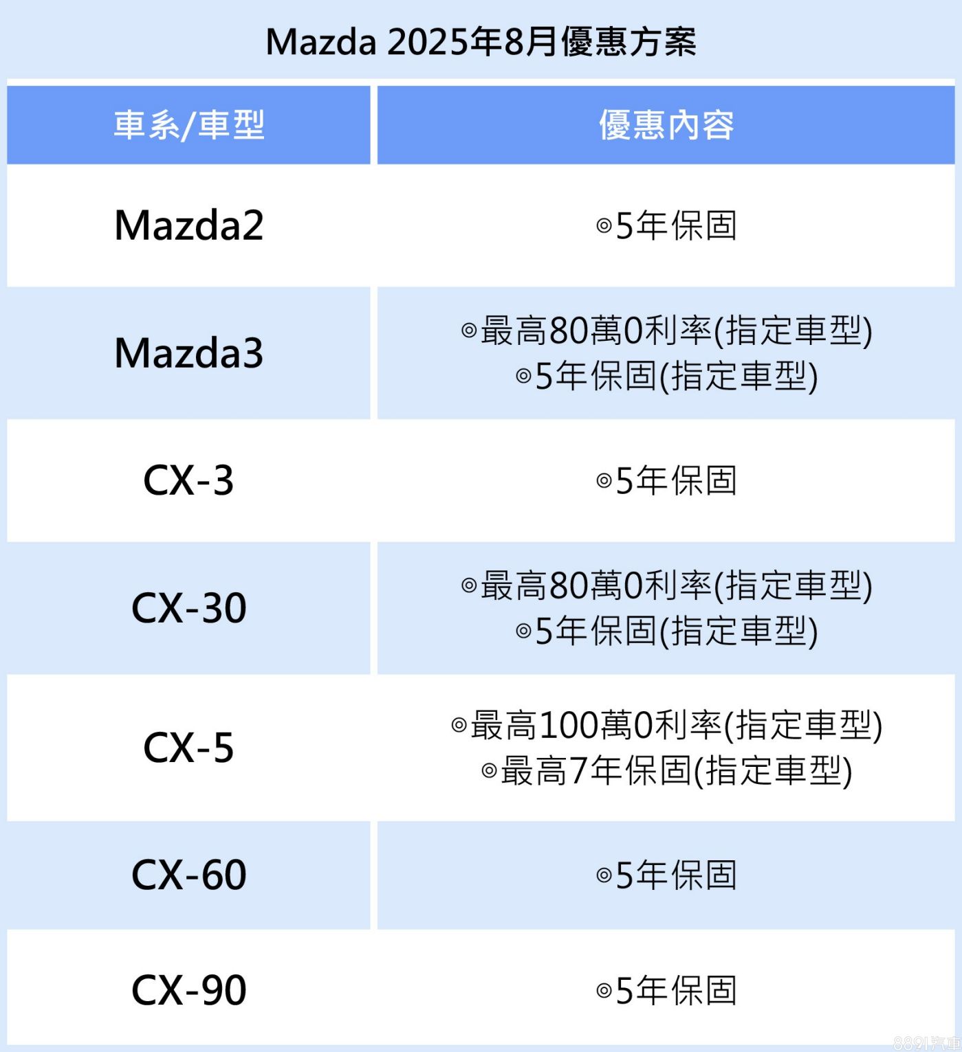至於受年輕世代歡迎的Mazda3和CX-30,入主Ace Edition及Premium車型均有5年原廠保固,Retro Sports Edition及Signature車型,除了同享5年原廠保固,亦適用最高80萬元0利率優貸方案。