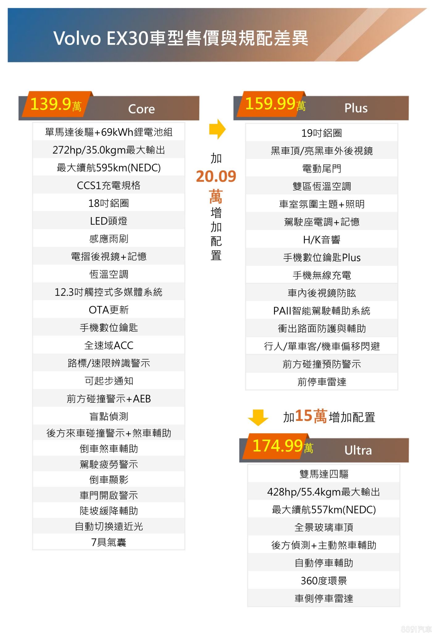 國際富豪汽車於今日(8/4)正式替Volvo EX30車系追加單馬達後驅車型,提供Core、Plus兩種配備等級,加上既有的雙馬達四驅Ultra,共3車型編成,售價分別為139.9、159.99與174.99萬元。