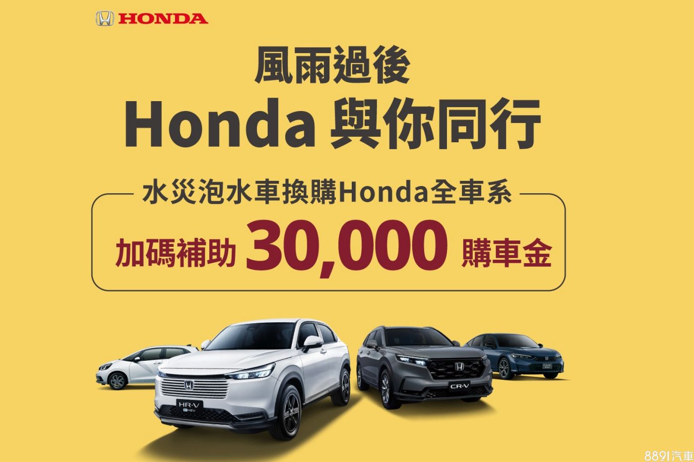 近期颱風與外圍環流帶來的豪雨重創全台,多處低窪地區傳出淹水災情,不少車主愛車慘變泡水車。在車主急需代步工具的關鍵時刻,Honda Taiwan宣布即日起啟動關懷專案,響應政府車輛泡水車最高2萬元慰問金補助,至9月底止,凡因水災導致車輛泡水,不限任何廠牌換購Honda全車系,並檢附相關泡水車證明文件,Honda Taiwan除提供當月促銷外,再加贈3萬元購車支援金,減輕車主負擔。