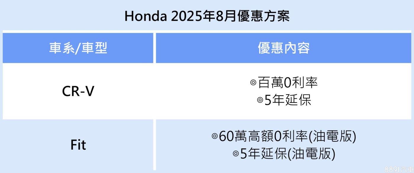 優惠方案部分,8月原廠針對CR-V、Fit指定車型,入主可享5年延長保固,以及最高100萬0利率優貸方案。另只要至Honda展間試乘,就有機會抽中iPad 11。