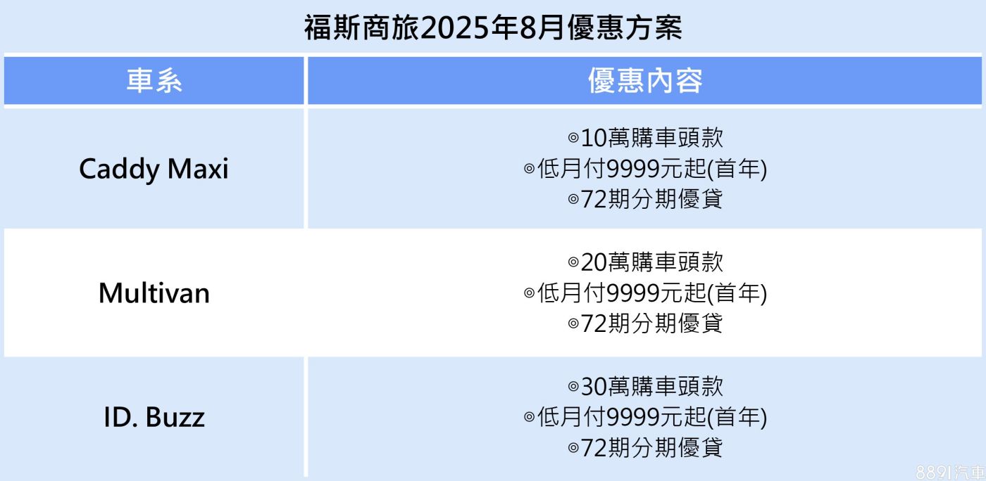 擅長打造MPV產品的福斯商旅,不僅車身尺碼及座椅設計有多元配置,還有汽油、柴油、純電動力等不同選擇,能夠滿足不同車主的多面向需求。本月原廠特別推出「超值德」優惠購車方案,至8/31止,入主Caddy Maxi、Multivan、ID. Buzz指定車型就享超低頭款、低月付,分期優貸,輕鬆享受VanLife樂旅生活。