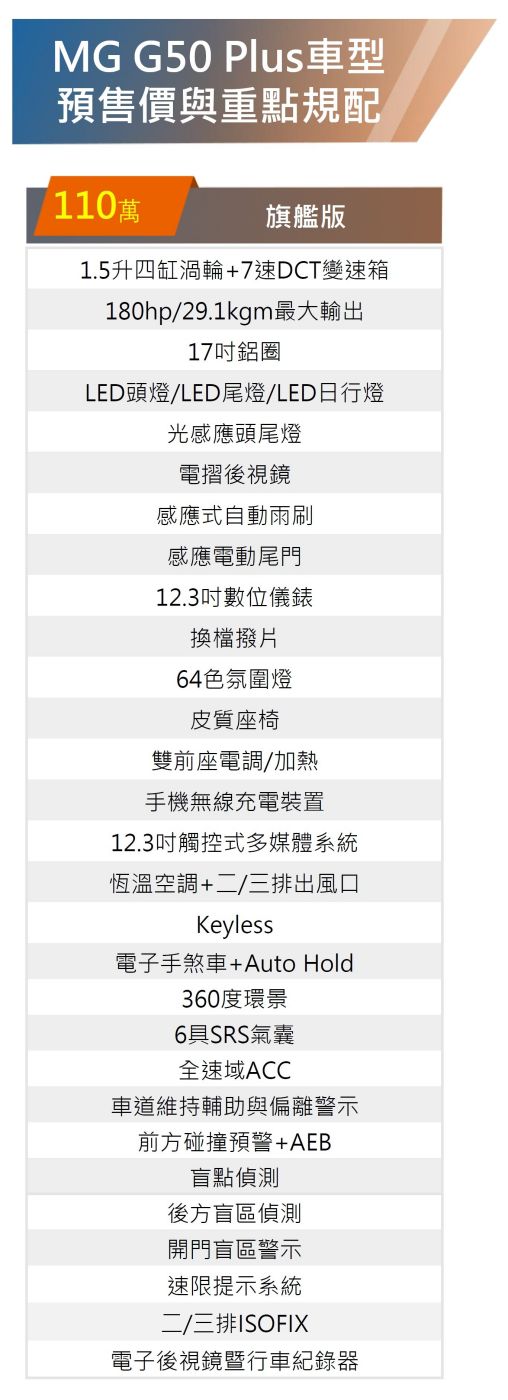 MG日前啟動G50 Plus國產MPV預售,規劃「旗艦版」單一車型、接單價110萬,並預告8/20正式上市。而近日MG Taiwan舉辦媒體試駕活動,終於讓規格與配備完整曝光,且活動中也透露,除了旗艦版外,還會提供主打豪華質感的「Premium」套件可作加選!