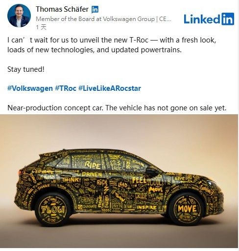 VW T-Roc的首張官方預告由品牌執行長Thomas Schafer在Linked In釋出,為第二代大改款車型預熱,預計8/27發表,於9/8開幕的IAA Mobility展出。預告圖雖有滿滿彩繪,但可看出新車延續跑旅輪廓,加入更多新世代獨有細節。