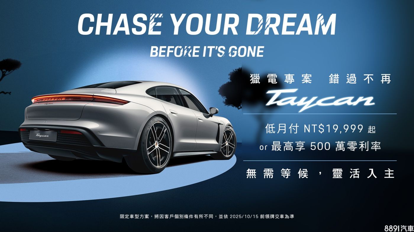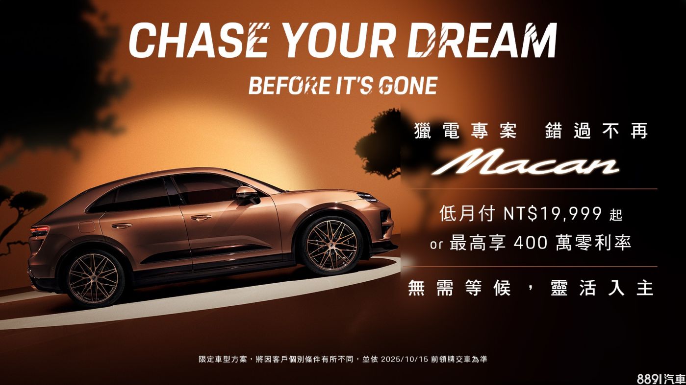 Chase Your Dream. Before It’s Gone。保時捷夏日獵電專案正式啟動:無需等待、現車領牌,搭配彈性財務方案,協助你立即成為保時捷尊榮車主。今夏限定,Taycan提供月付19,999元起或最高500萬零利率;都會純電戰力Macan Electric同步推出月付19,999元起或最高400萬零利率,入主時機就在此刻。