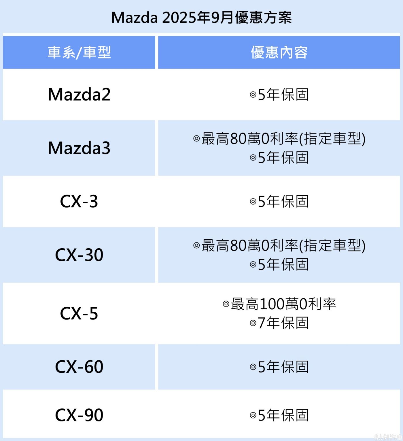 台灣馬自達為此也特別於本月份加碼購車優惠,針對全車系祭出「100萬元高額0利率」的方案,並同步加贈「第4年至第7年延長保固」,其餘車款指定車型亦同享5年保固、高額0利率等方案。