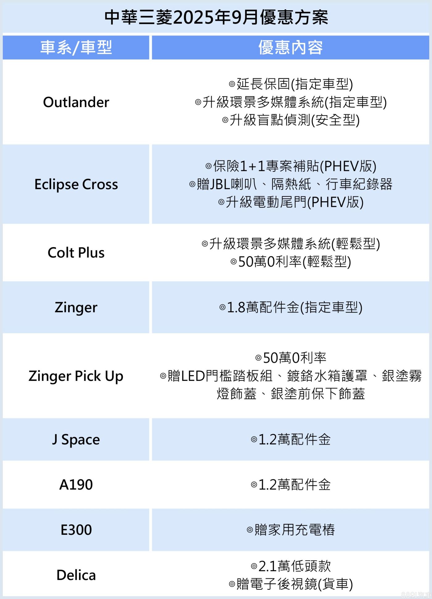 中華三菱本月優惠上線,針對當紅車款如Zinger、J Space,均祭出配件金,前者1.8萬、後者1.2萬。頭家好朋友Zinger Pick Up,除了適用50萬0利率優貸,加贈LED門檻踏板組、鍍鉻水箱護罩、銀塗霧燈飾蓋、銀塗前保下飾蓋等,讓外觀扮相更獨特。