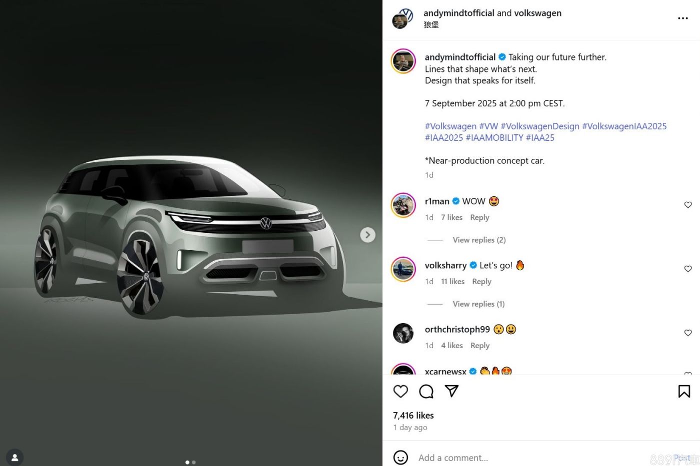 VW日前公布2025 IAA Mobility主視覺以及參展陣容,當時提到大改款T-Roc、Golf GTI Edtiion 50th紀念版、ID.3 GTX特仕版以及一款全新純電概念休旅,都會同場亮相。正當外界好奇這款概念車長怎樣時,福斯設計部門主管Andreas Mindt在個人社群平台親自為大家解答! (圖翻攝Andreas Mindt Instagram)