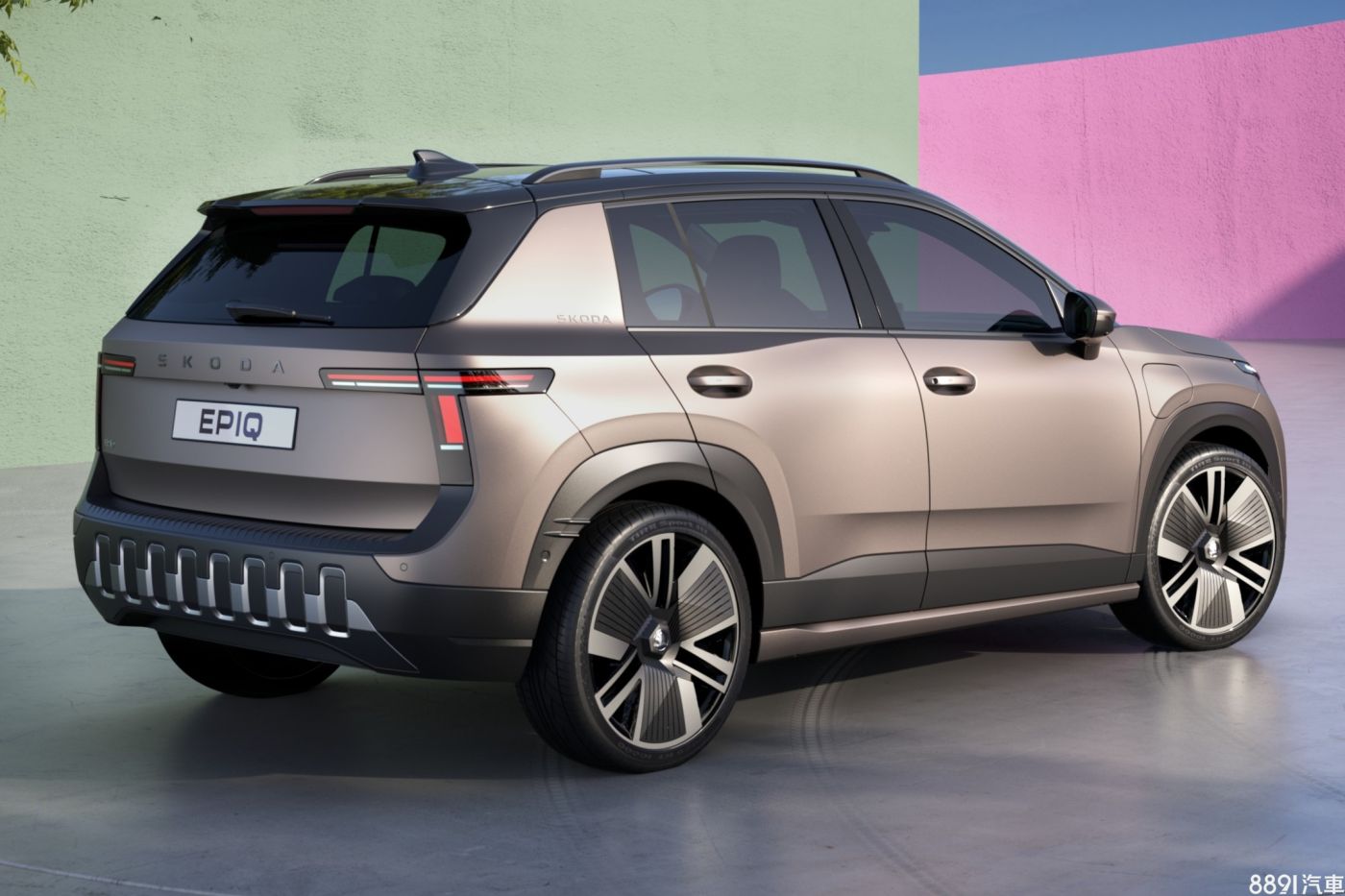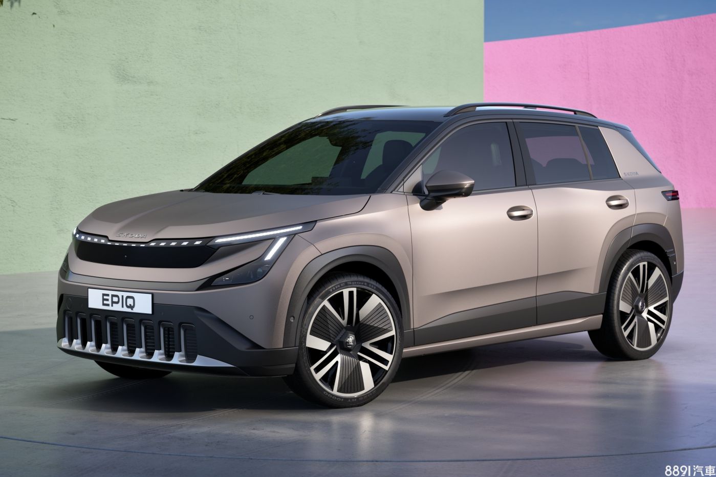 Epiq為Skoda首款完整採用「Modern Solid」設計語彙的作品,以大膽、極簡的線條強化都會SUV姿態,霧面Cashmere車色搭配亮黑Tech-Deck Face,T字型日行燈與下置頭燈營造俐落視覺,全新「tornado line」切割出更飽滿的肩線與玻璃艙體比例,呈現堅實、功能導向又具現代感的身形,車長4.1m、五人座設定,精準鎖定日常城市使用。