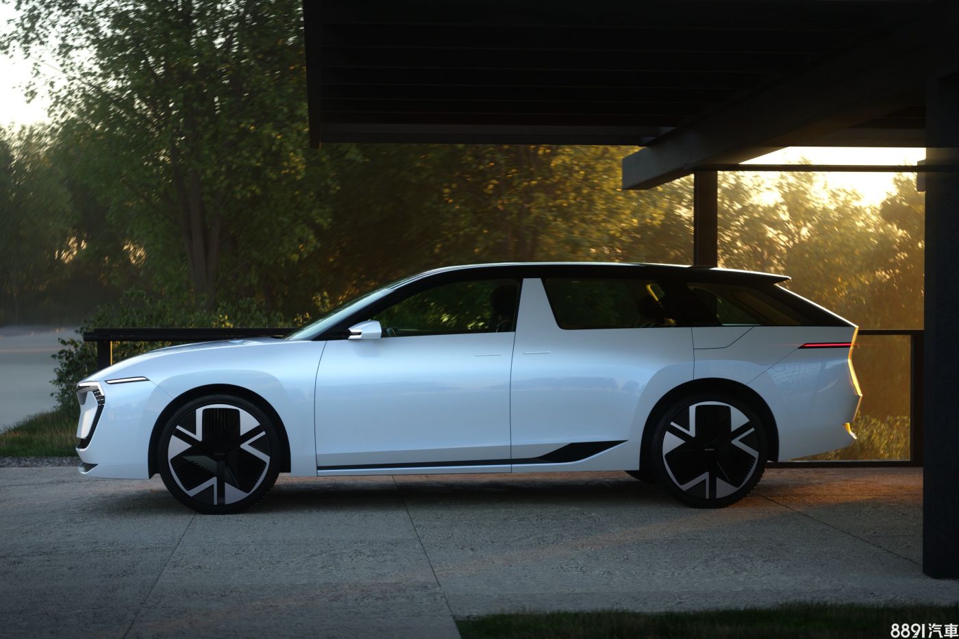 尾部則以T型LED尾燈與連貫式燈帶呼應車頭,營造強烈的整體感。車色使用特殊塗裝,能隨光線折射變化,搭配懸浮式黑色車頂與全景天窗,展現科技感與優雅氣質。