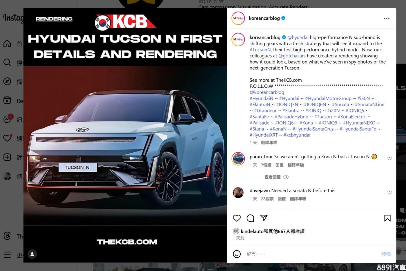 而根據外媒掌握資訊,Tucson N預計採用全新1.6T油電動力架構,並搭載後軸電動馬達(e-axle)形成四驅系統,綜效馬力有望突破300hp,並且會有更熱血的底盤設定,針對賽道與山路調校的煞車、彈簧阻尼、電子差速與N專屬駕駛模式,假想敵鎖定Toyota新一代RAV4 GR Sport,其採用2.4升自然進氣引擎+雙馬達配置,綜效輸出320hp。(圖/翻攝@koreancarblog)