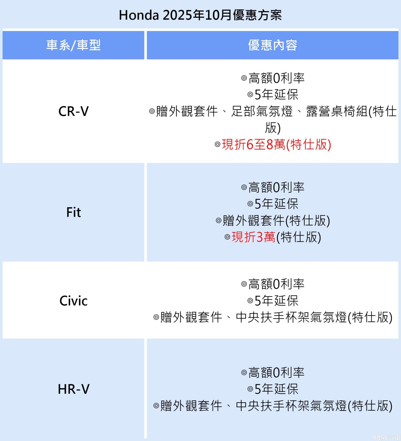 除了滿滿的配備升級、加量不加價外,針對CR-V,依車型不同,車價更可享6至8萬現金優惠;而Fit則現折3萬!另全車系均適用延保、高額0利率專案。