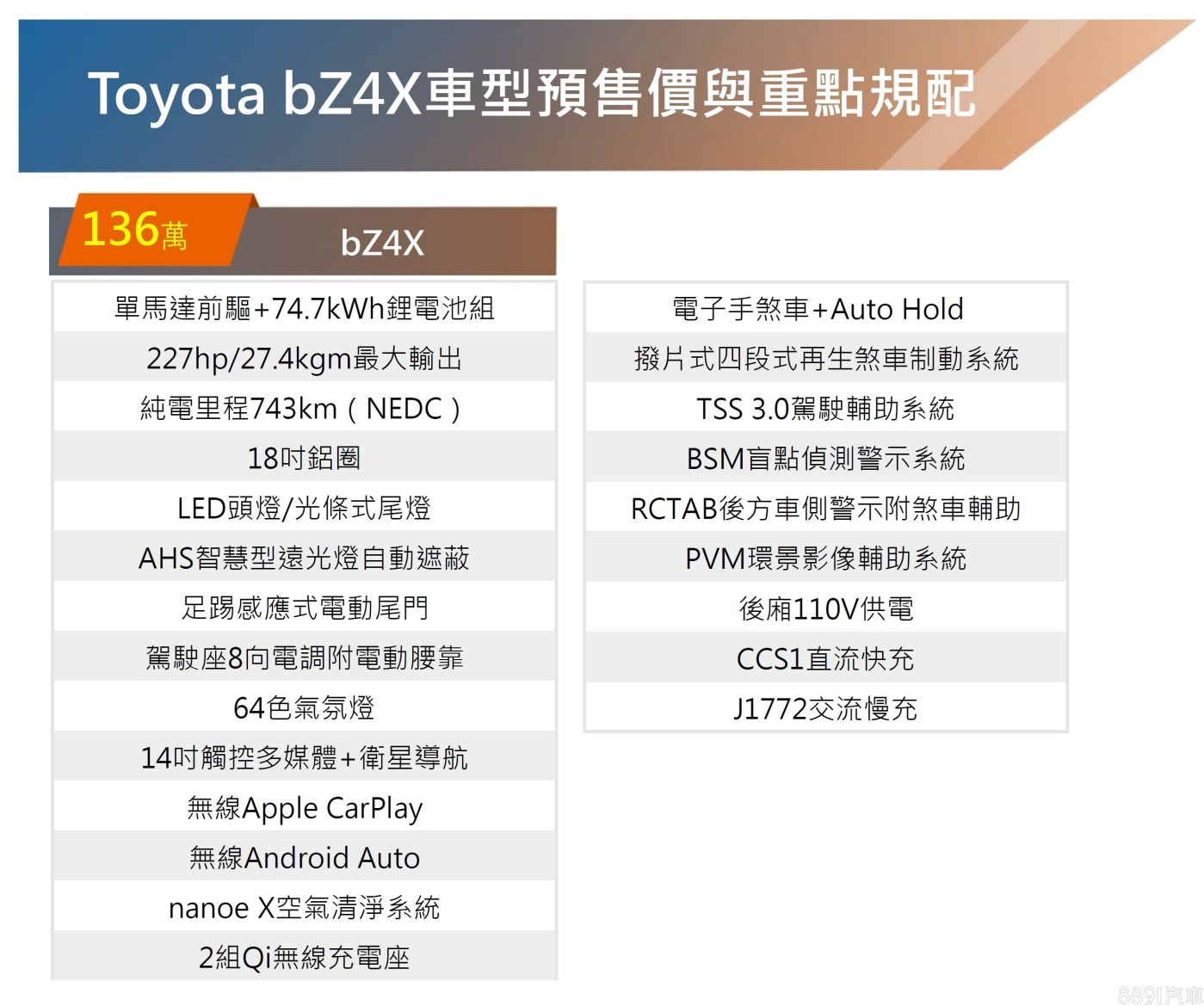 動作真快!今年3月於歐洲發表的小改款Toyota bZ4X,如今已經悄悄現身國內官網,採單一車型、預售價136萬,定價跟改款前相當,即日起開放訂購,也有公佈簡易規配,但確切規格請以正式上市為準。