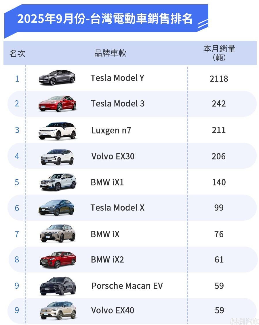 BMW本月多點開花,iX1(140台)、iX(76台)、iX2(61台)分佔榜單中游。若以品牌電動車累積銷量來看,Tesla今年截至9月掛牌10490輛,可說是遙遙領先,而第二名就是BMW的2753輛,與後方的Luxgen還有約200台的差距。