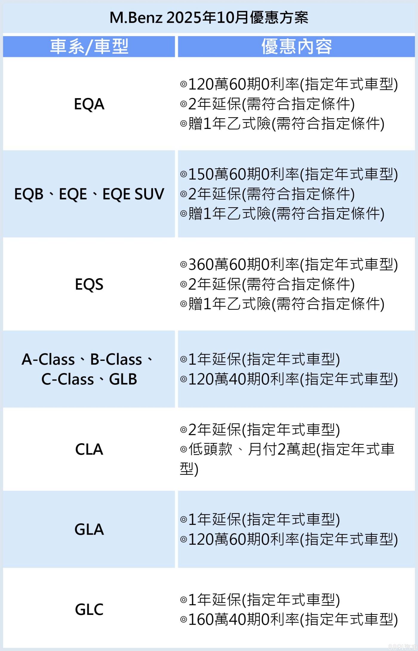 10月M.Benz優惠最豐富的當屬電動車系列,EQA指定年式車型提供120萬60期0利率;EQB、EQE以及EQE SUV則祭出150萬60期0利率;旗艦純電房車EQS,更是推出360萬60期0利率的重磅優貸方案,以上均同步享有2年延保與1年乙式險,讓買家能以更優惠的方式輕鬆享有豪華電動移動體驗。