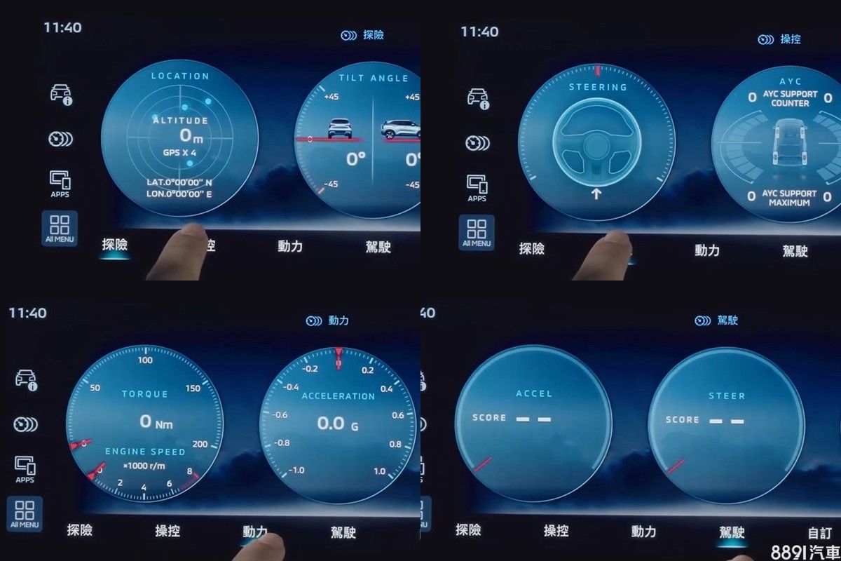 官方除了演示啟動動畫,也透露畫面背景可自訂切換,觸控車機的車輛資訊功能還能充當輔助儀錶,能顯示扭力輸出、加速G值、轉向幅度、海拔經緯、車輛仰傾角度、AYC扭力分配計等車輛資訊。